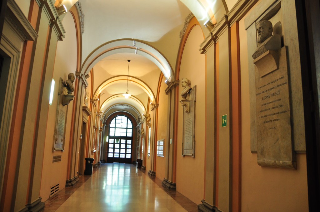 Wir verlängerten die Reise, um die älteste Universität in Europa anzuschauen. Tags darauf reisten wir erwartungsvoll nach Bologna. Das Wort «Bologna» hegt derzeit bezüglich der Hochschulreformen nicht gerade eine positive Konnotation – doch die Stadt ist mit ihren schattigen Arkaden und rot-braunen Gebäuden wundervoll. Die Universität, die vor über 900 Jahren gegründet wurde, ist omnipräsent. Voller Ehrfurcht traten wir ins Hauptgebäude ein und bewunderten das architektonische Wunderwerk. Wir schritten durch leere, marmorne Gänge und liessen die Atmosphäre wirken.