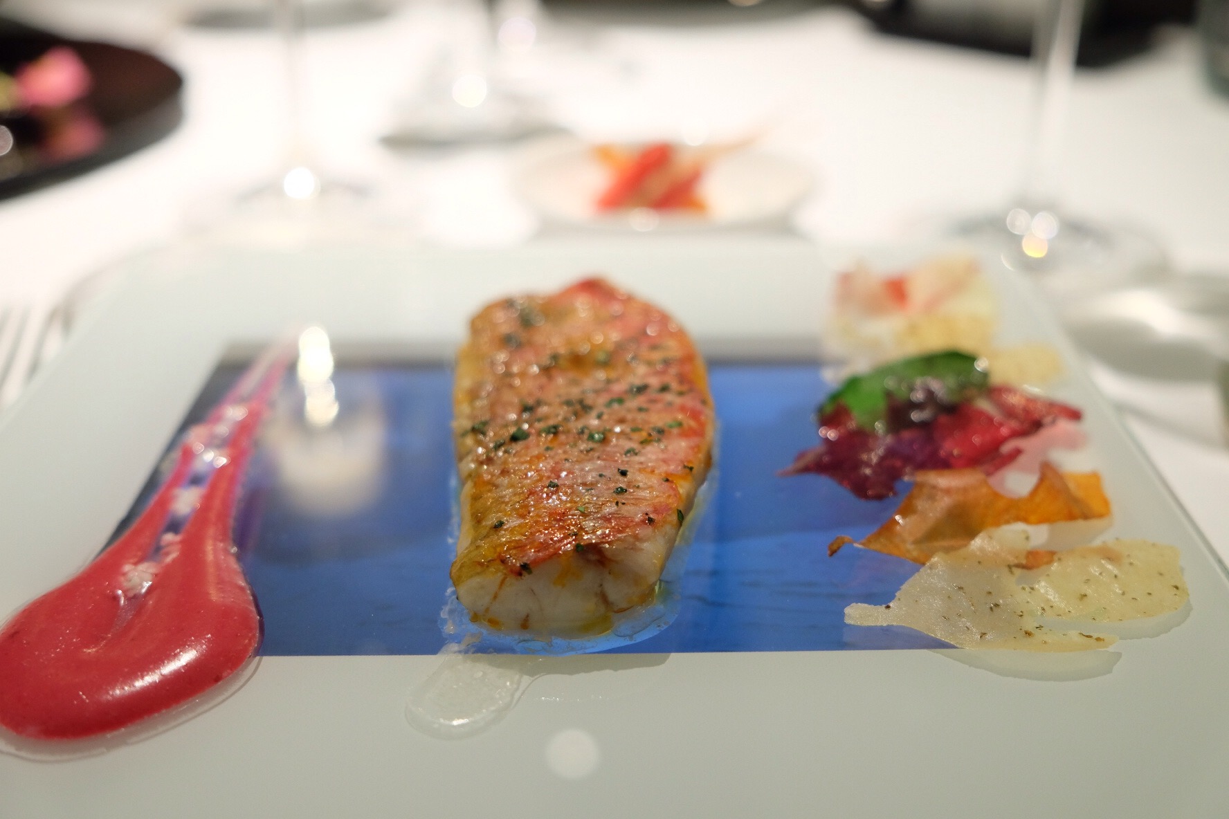 Beim nächsten Gang wurde mir zuerst ein Pad geliefert, auf dem ein Film mit Wellen lief. Danach folgte ein Glasteller und darauf der Fischgang. Jeder Schritt des Menüs wurde richtig zelebriert. Beschrieben habe ich bis hierhin nur die Hälfe. Danach wechselten wir den Wein und assen noch weitere vier Gänge und einige Zwischengänge.
