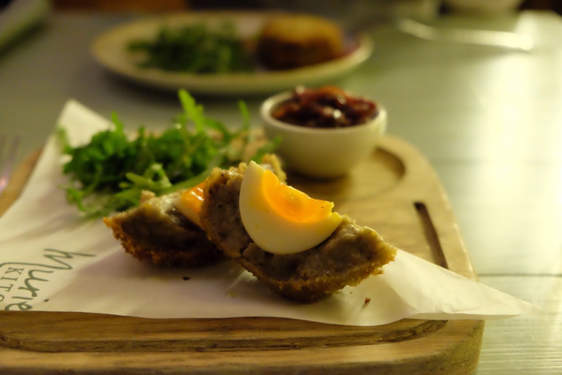 Mein Essen war ein Scotch Egg (im Bild) und danach ein Lachsfilet mit Federkohl-Granatapfel-Ebly. Der Zweigänger gabs für unschlagbare 12 Pfund, da soll noch jemand sagen, London ist teuer.