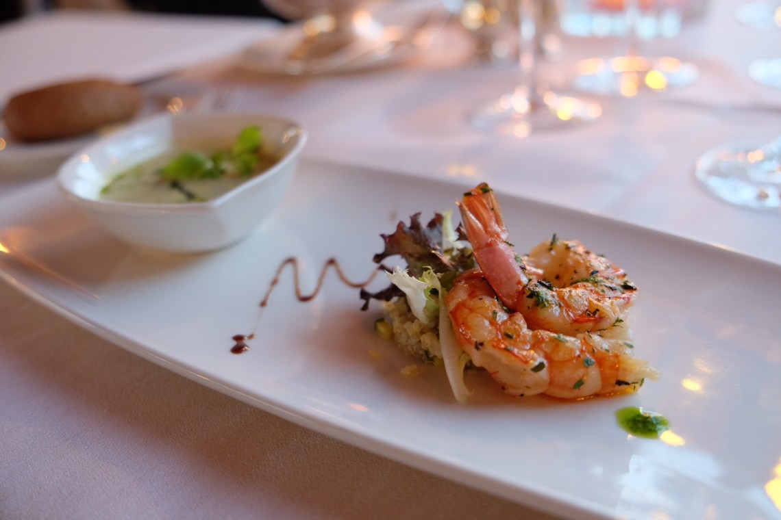 Wir bestellen das Überraschungsmenü (140 Franken) und eine weniger überraschende Weinreise (90 Franken für 5 Gläser). Der Gruss, das Barsch-Trio (oben im Bild), die Crevetten mit Gazpacho (unten im Bild) und der Käse waren hervorragend.