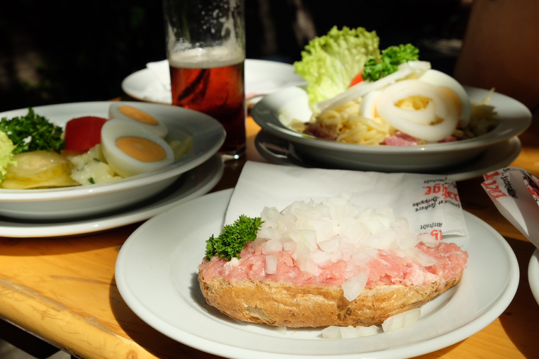 Eigentlich haben wir Hunger, drum bestellen wir hausgemachten Kartoffelsalat, Mettbrötchen, Soleier mit Senf und den Wurst-Käsesalat (insgesamt 15.50 Euro).