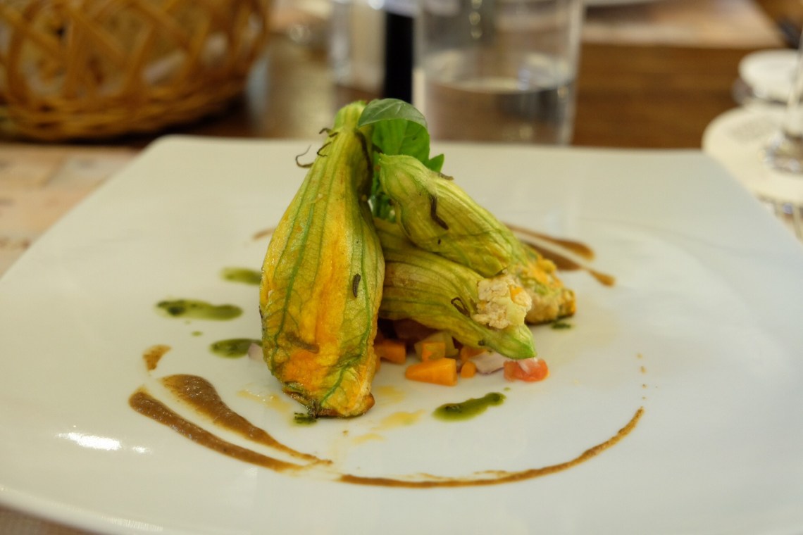 Zum Essen teilten wir uns ein Plättchen, als Hauptgang nahm ich die mit Ricotta und Crevetten gefüllten Zucchiniblüten (12 Euro, ganz oben im Bild). Und natürlich konnten wir es nicht lassen, ein Glas der berühmten Weine zu bestellen: Sassigaia und Ornellaia, bestellbar in halben Deziliern, ab 13 Euro. Und jeden Euro wert!