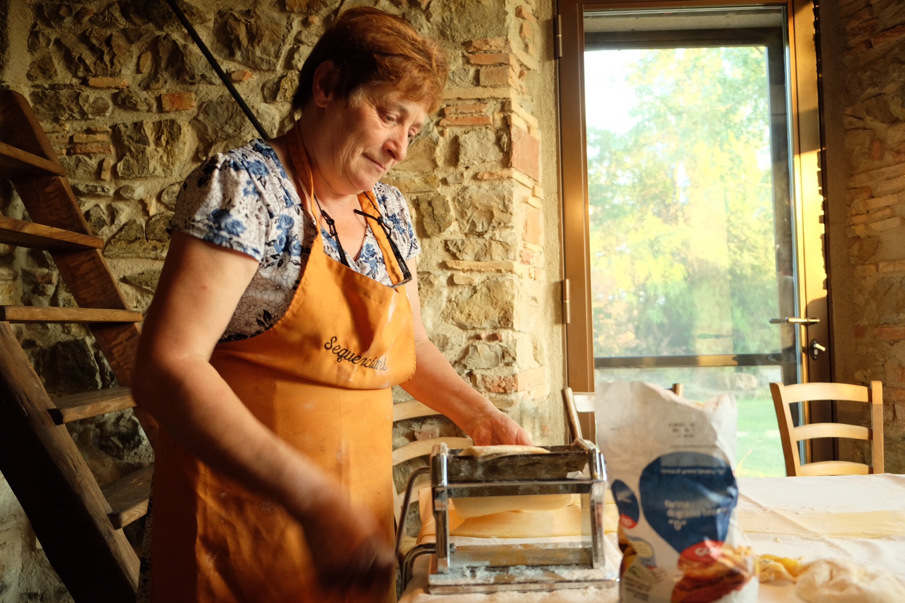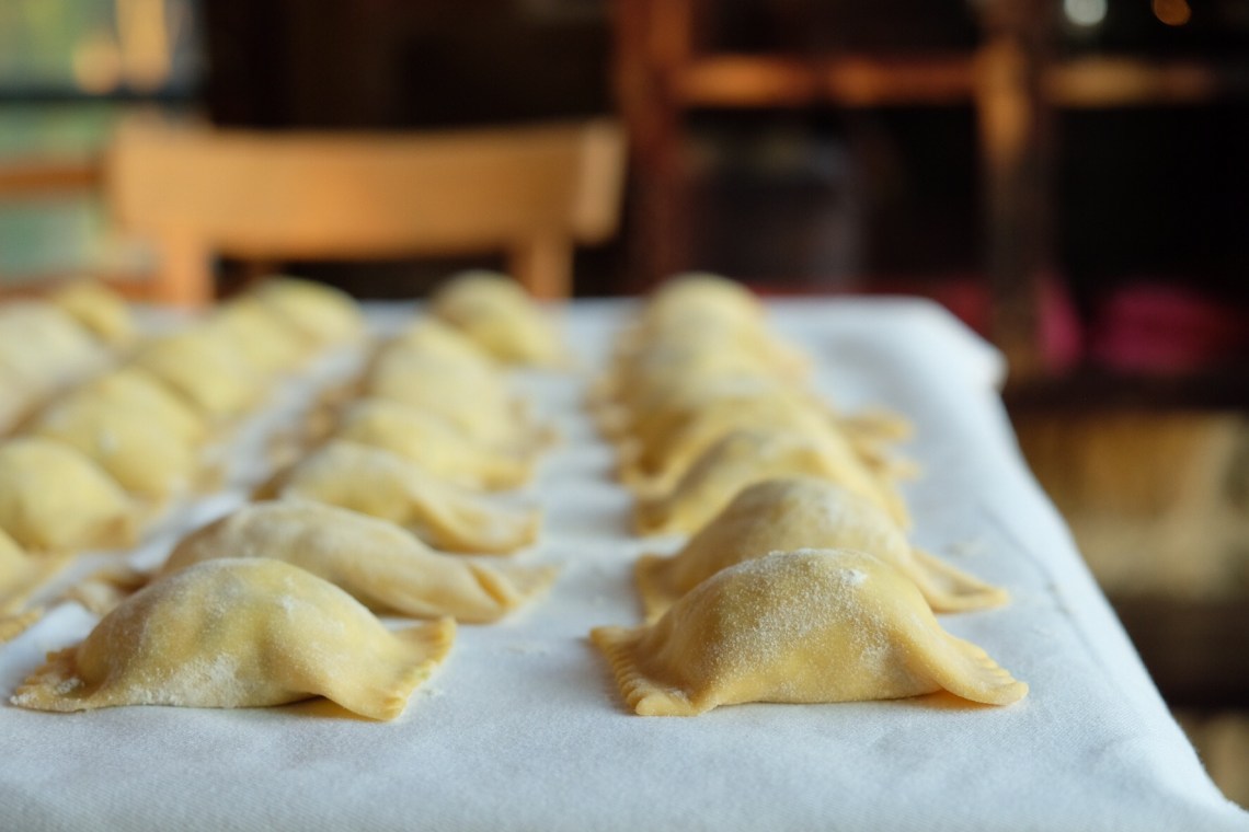 Am letzten Abend war nebst Enna eine zweite Köchin am Werk, um die Ravioli zu befüllen. Das Spektakel wurde von allen beobachtet, was beiden ein bisschen peinlich war. Während Enna den Teig durch die Maschine drehte und Chiara Ricotta-Häufen auf ausgewallte Teige setzte, brutzelten Scallopine al Limone im Ofen und ein Tiramisu wartete im Kühlschrank.