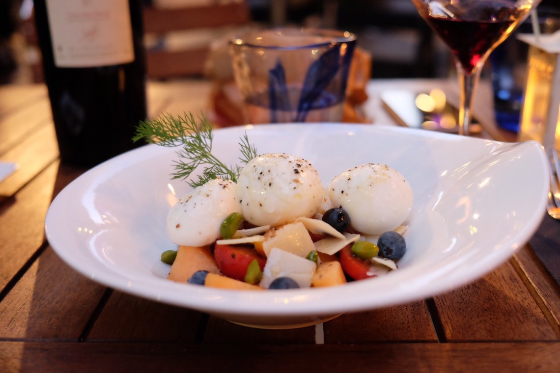 Die Vorspeise war ein fruchtig interpretierter Caprese-Salat: Nebst Cherrytomaten und Büffelmozzarella peppten Blaubeeren und Honigmelonen auf. Ich war so begeistert, dass ich die Kellnerin fragte: „Ist der Koch schon verheiratet?“ Sie schaute mich entgeistert an und bestätigte es, genau wegen dem sei er verheiratet. „Mit dir?“ Sie lachte und sagte ja.