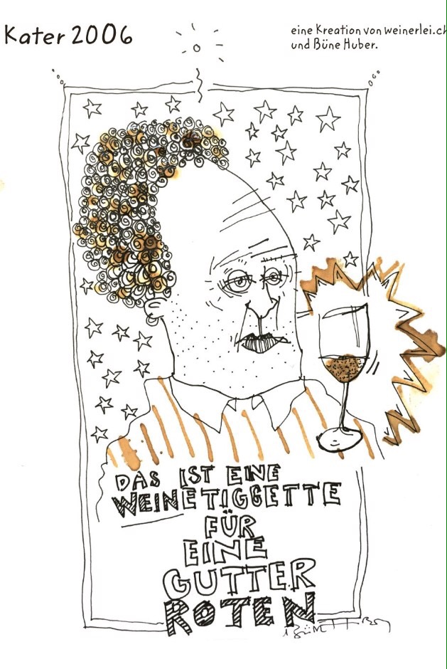 Auch toll ist die Etikette: Diese wurde von Büne Huber gezeichnet. Via Management bekam die KG Gastrokultur eine Absage, doch als Büne in Le Beizli – einem weiteren Lokal – zum Znacht war, machte er mit. Nicht länger als 5Minuten habe er gebraucht, erzählte mir der Michel Gygax von Weinerlei, um sie zu gestalten. Buntstifte hatte der Sänger natürlich keine dabei, die braune Farbe stammt vom Kaffeesatz seines Espressos…