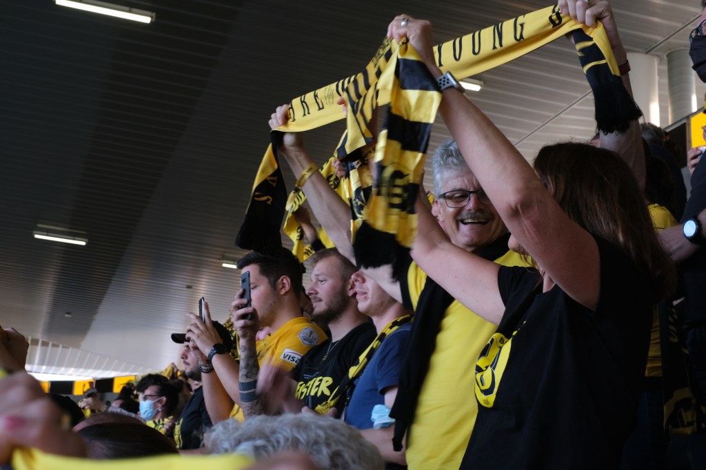 Mittlerweile sind wir bei den Sitzplätzen im Sektor B9 angekommen. Die Sonnenstrahlen tauchen den voll besuchten Sektor D in gelbes Licht und vergoldet die Rückkehr der Fans ins Stadion. Alle ziehen ihre Schals aus, singen als hätte es keine anderthalb Jahre lange Wankdorfpause gegeben. Die Hühnerhaut ist da, die Tränen stehen manchem Anhänger in den Augen. Zur Pause steht es 2:0 für die Gelb-Schwarzen. David von Ballmoos hält einen Penalty, was Kenner Marco Rupp vorausgesehen hat. Sein Tipp stimmt sogar fast, aber auch so ist es ein Fussballabend fürs hoffentlich nächste Meisterbuch.
