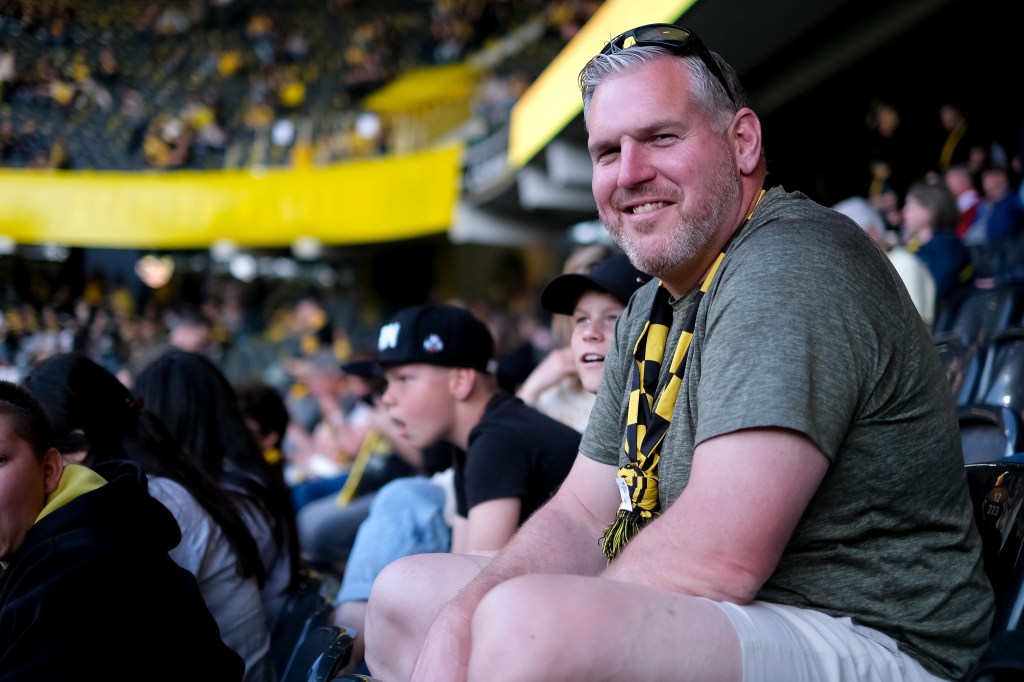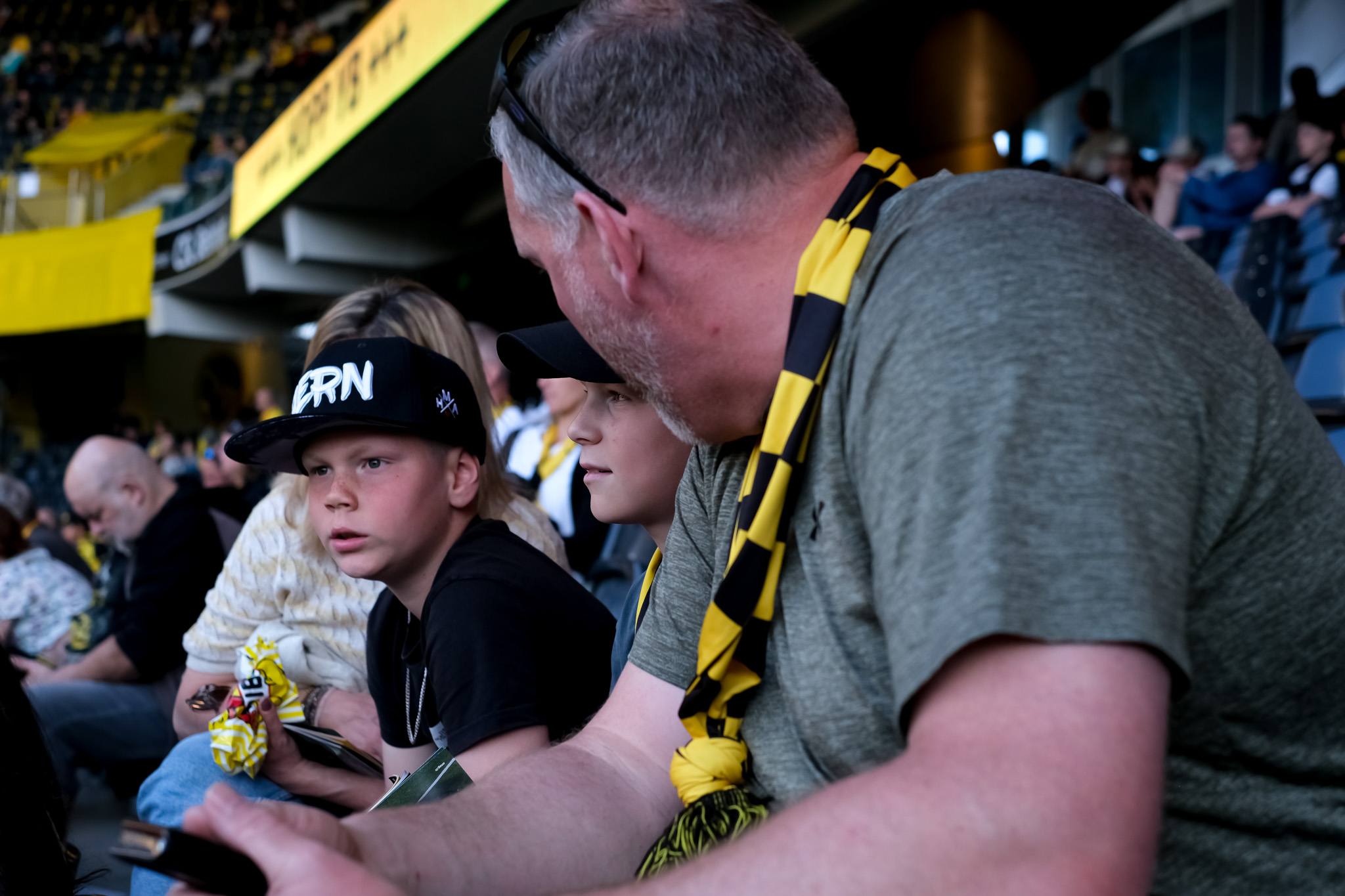 In Reih und Glied sitzt die Familie Stucki auf ihren Plätzen im Sektor A5. Cecile spielt mit Sohn Elia (8) auf dem Handy einen Online-Jass. Daneben sitzen Xavier (11) und sein Vater Christian Stucki, beide mit dem gleichen Schalk im Gesicht. Das Spiel hat noch nicht angefangen, also bleibt Zeit für Statistiken und Platzobservationen. Unten auf dem Feld wärmen sich die Spieler ein. “Ich tippe auf ein 3:0”, sagt Vater Stucki.