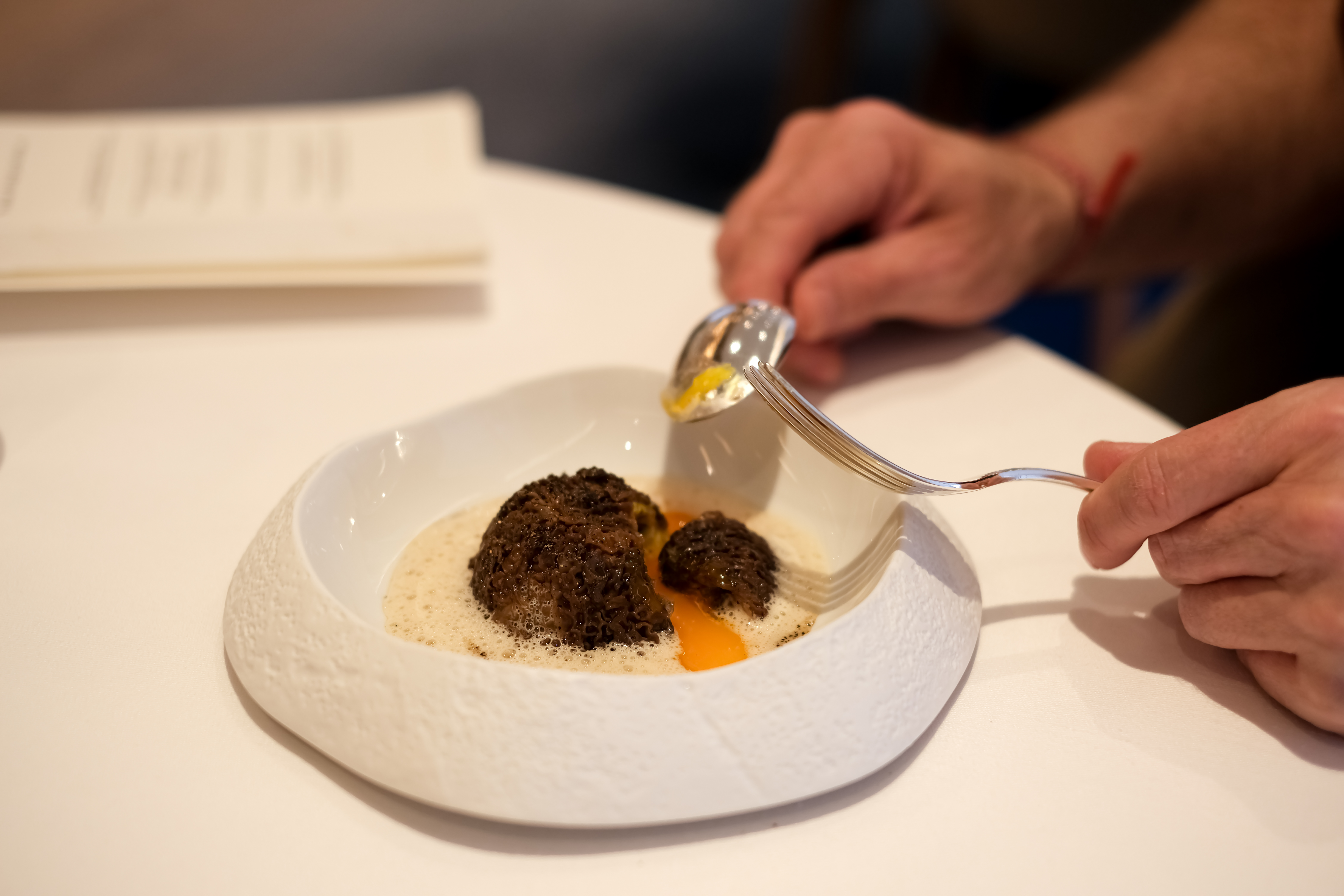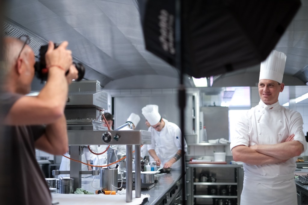 Das Menü wechselt wie die Jahreszeiten. Eine Mitarbeiterin putzt Morcheln, die beim vegetarischen Zwischengang mit einem Ei und einer Beurre Blanc serviert werden. Eine Köchin hat gerade fein säuberlich die Spargeln aufgeschnitten und kreisrund drapiert. Desbraux zieht das Ganze vom Teller noch einmal auf ein Papier – das Gemüse hat zu schnell zu viel Wasser gezogen.
