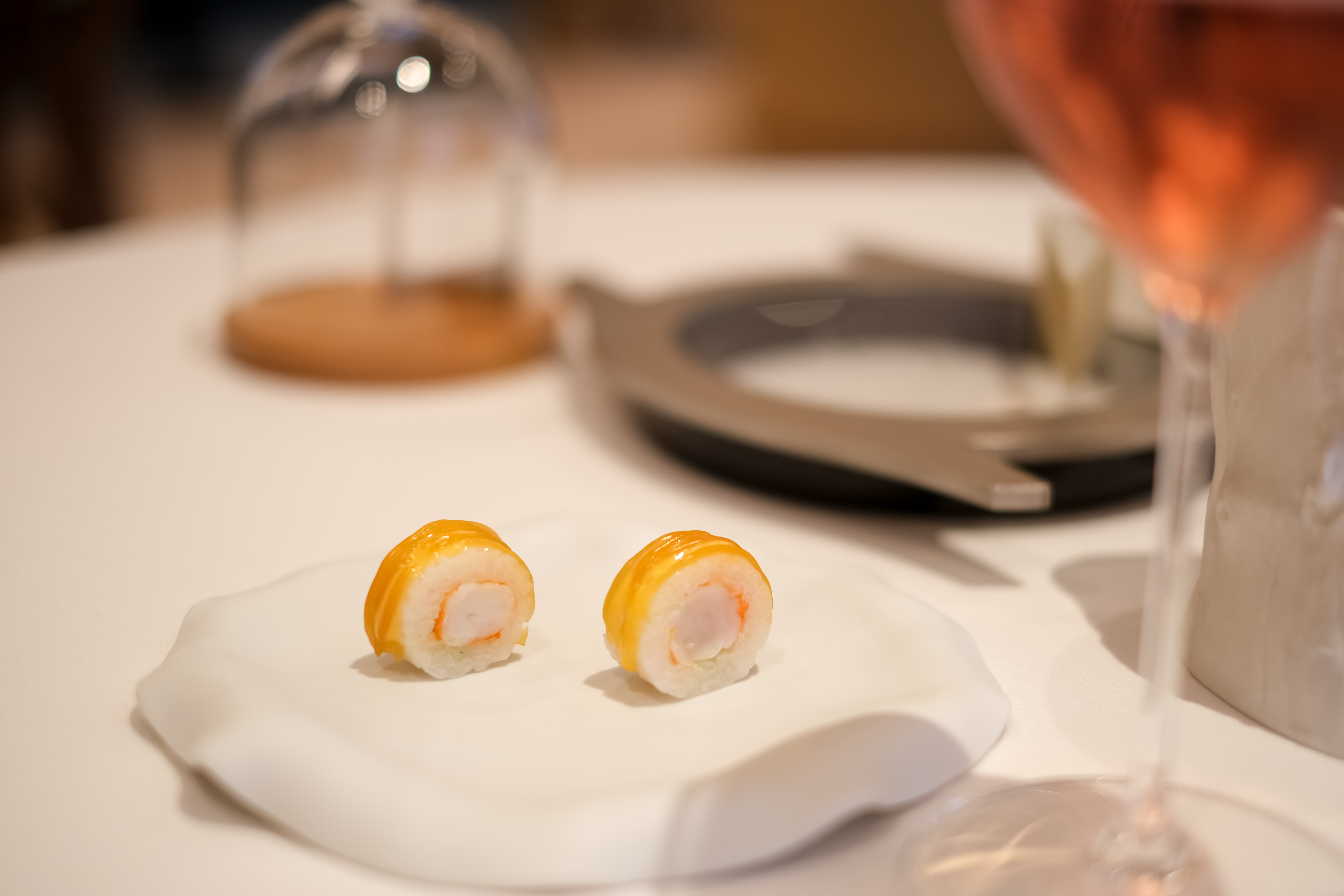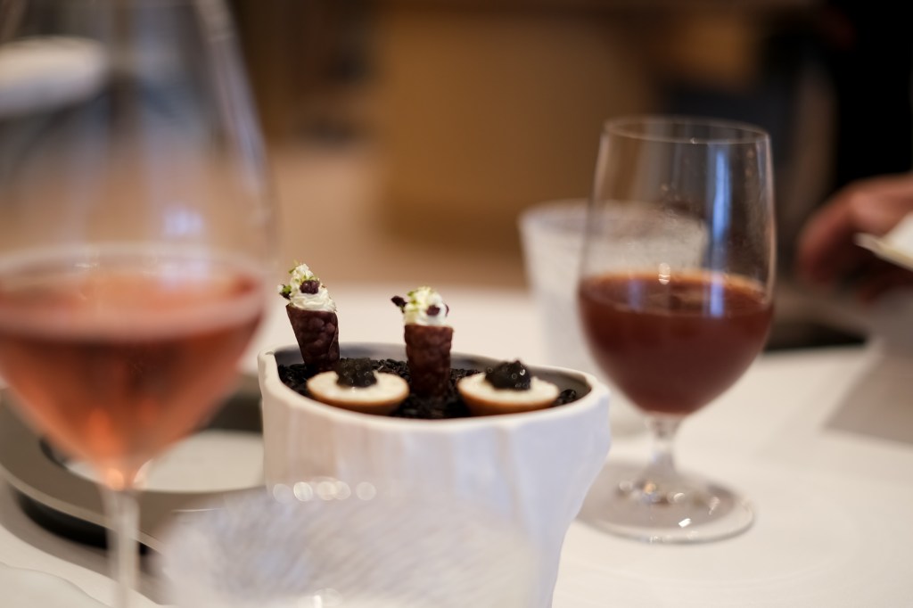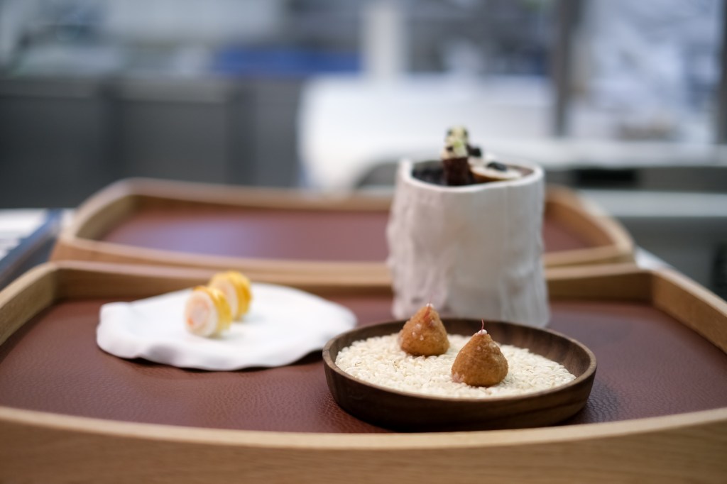 Seit März ist das Restaurant des Maison Wenger nach einem Totalumbau wieder offen: elegant, hell und passend zu den zwei Michelin-Sternen und den 18 GM-Punkten. Im Speiseraum, der auch in Paris sein könnte, hat Anaëlle Roze die ersten Gäste empfangen. «Zwei Apéro», ruft ein Kellner in die Küche. «Oui», bestätigen alle. Sofort folgt ein Plateau, auf das zwei Teller – gefüllt mit rohem Vully-Reis – gestellt werden. Von allen Seiten werden ein Arancini, ein Cornetto mit Frischkäse, eine Tartelette mit Reisfüllung und Kaviar sowie Maki mit Basler Crevetten gebracht.