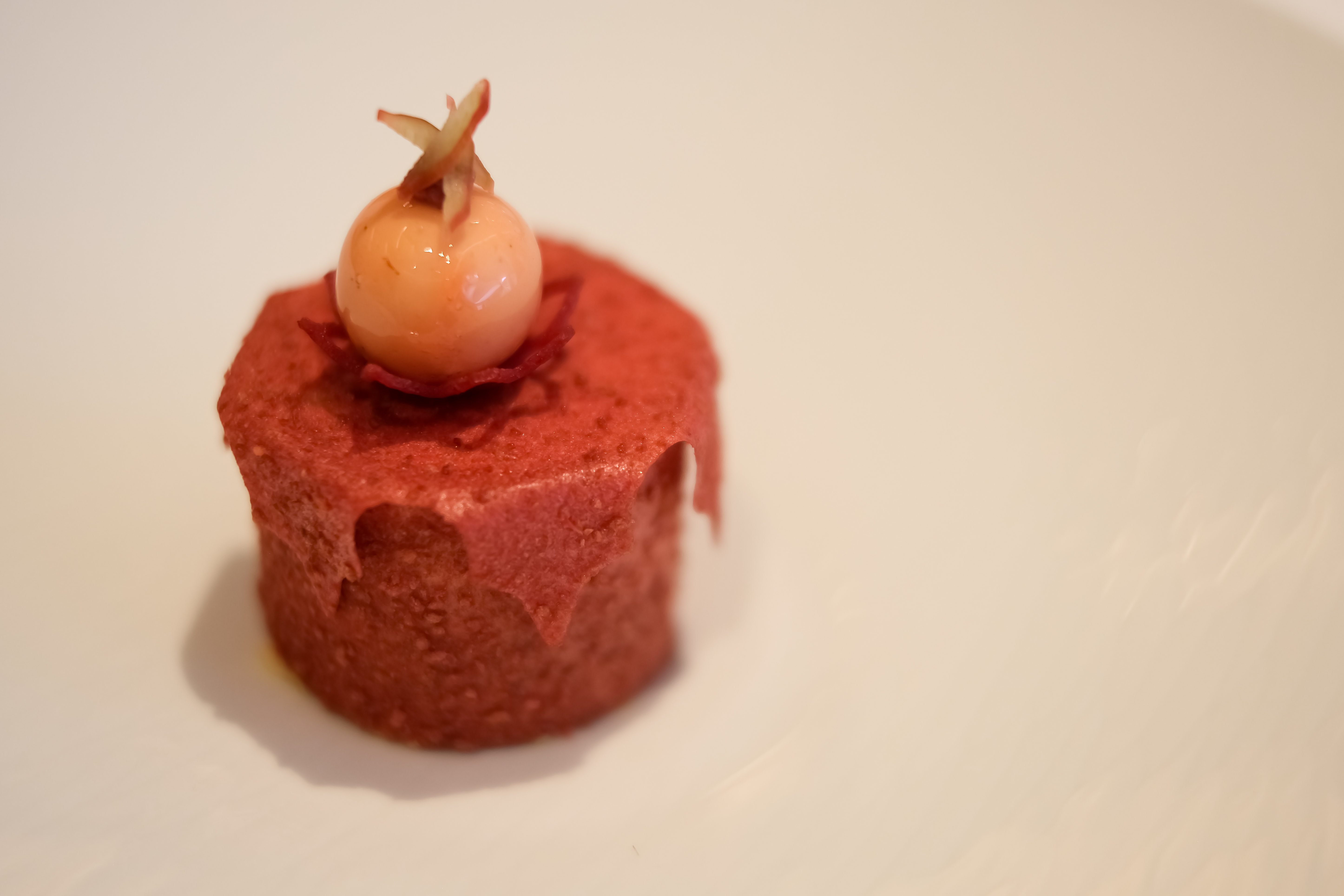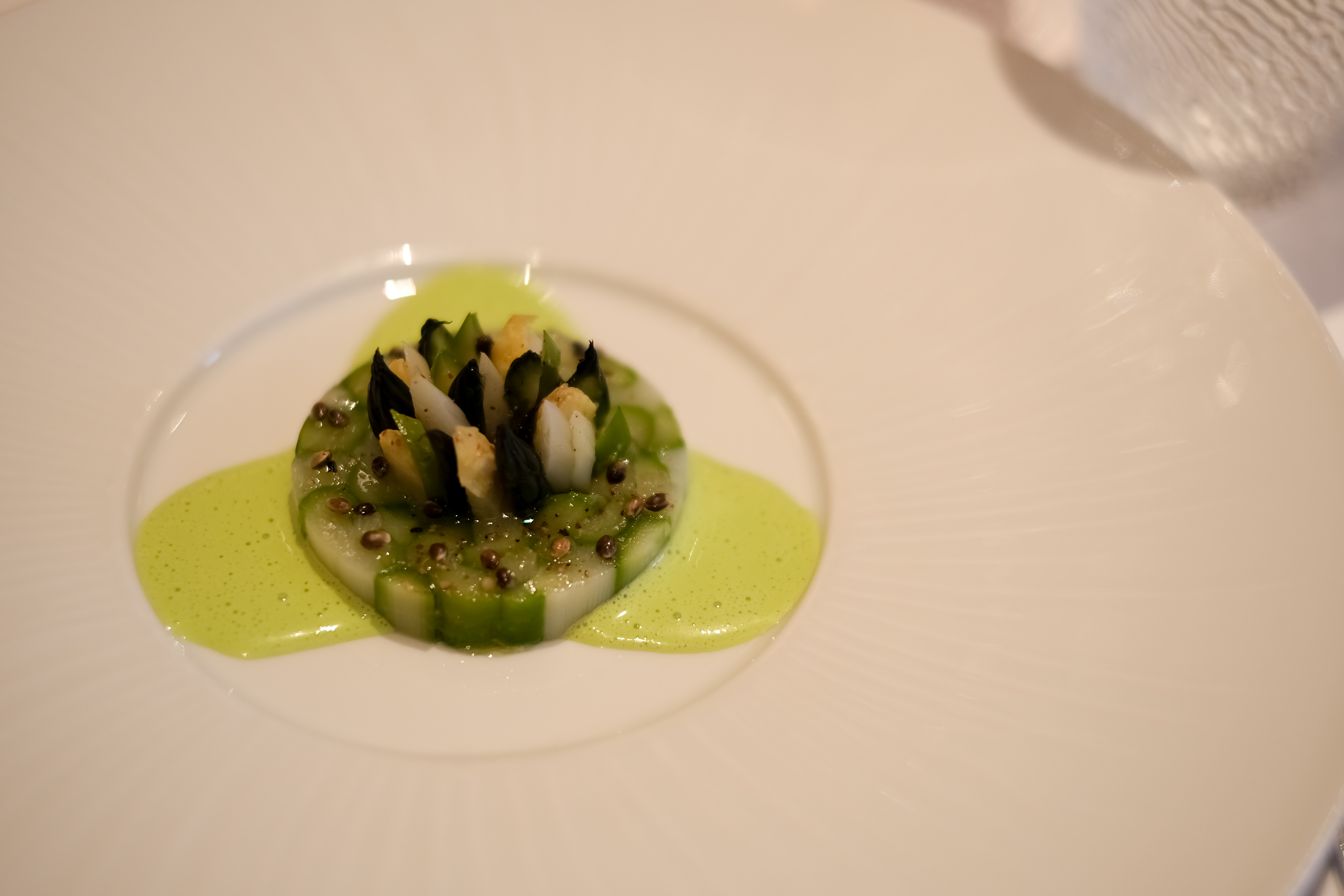 Nach dem Spargelgang mit Hanfbuttersauce und Hanfsamen und dem Morchel-Gang folgt ein kurz angebratener und flambierter Saibling mit Mini-Crôutons und Blüten an einem säuerlich-frischen Pflanzensud aus Oxalis und Rhabarber. Nach einer unglücklichen Lehre, in der Desbraux zu oft nur mit dem Küchenchef oder sogar ganz alleine war, heuerte er in Südfrankreich in Sternelokalen an.